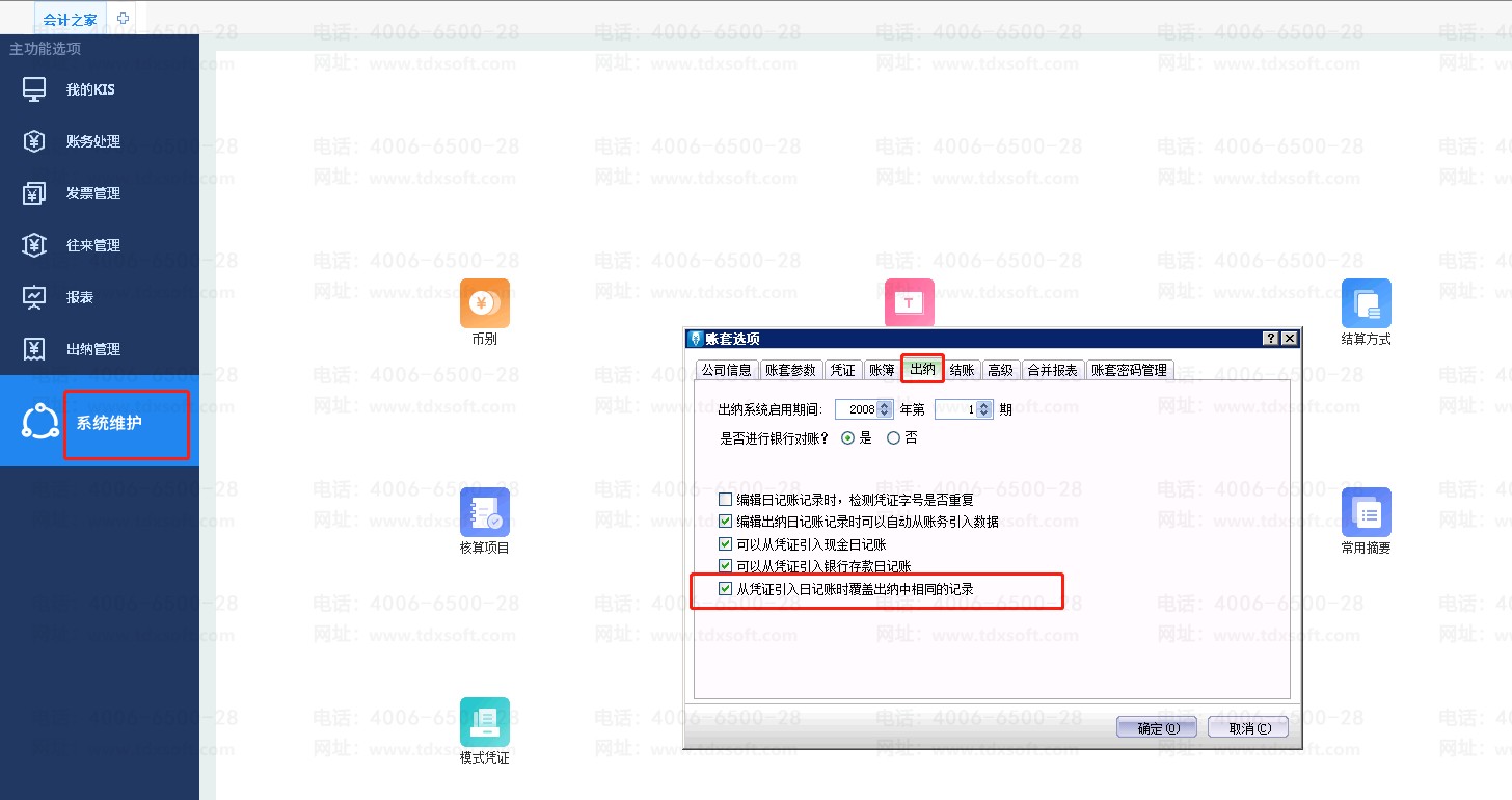 登陆软件主界面,依次点击【系统维护】-【账套选项】-【出纳】-【从凭证引入银行日记账时覆盖出纳中相同的记录】打勾。
