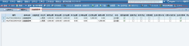 出差借款单的其它操作包括两大类,一类是在序时簿上,另一类是在单据上。