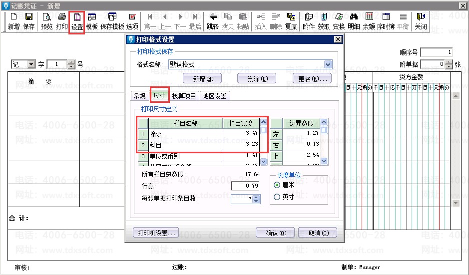 迷你版,标准版不使用套打如何设置凭证科目栏或摘要栏的打印宽度?