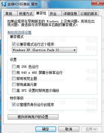 选择金蝶KIS标准版图标,单击右键[属性]-[兼容性]设置以兼容模式运行此程序以及以管理员身份运行此程序即可。