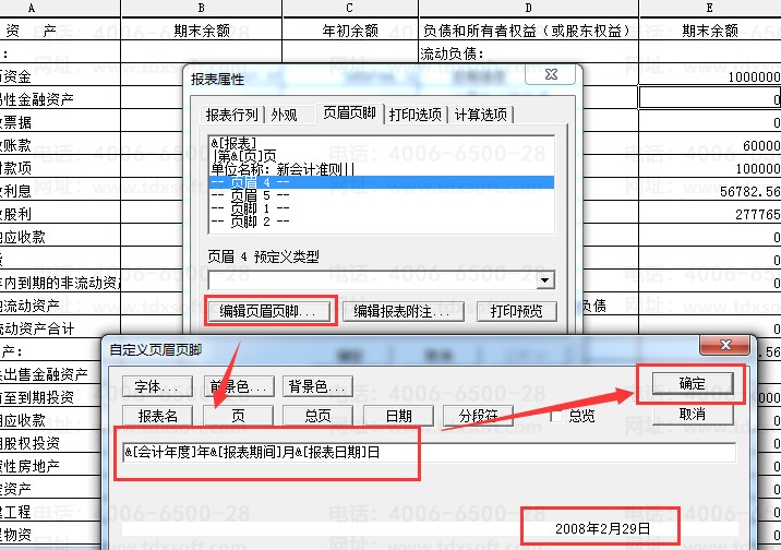 4、单击[编辑页眉页脚],在窗口的空白处键入“&[会计年度]年&[报表期间]月&[报表日期]日”;