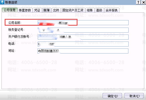 2、在[账套参数]页签,[账套名称]文本框中键入正确的单位名称,单击[确定]按钮保存设置。