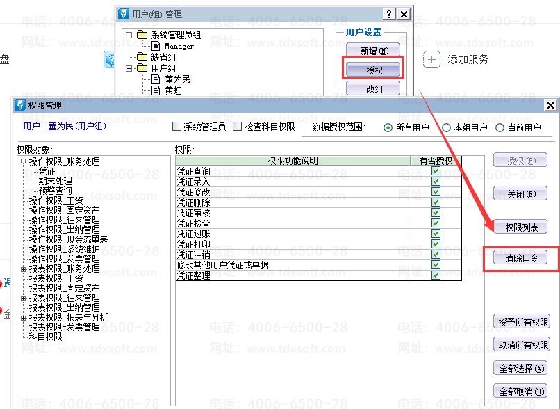 2、点击[工具]-[用户管理]-选择忘记密码的用户-[授权]-[清除口令];