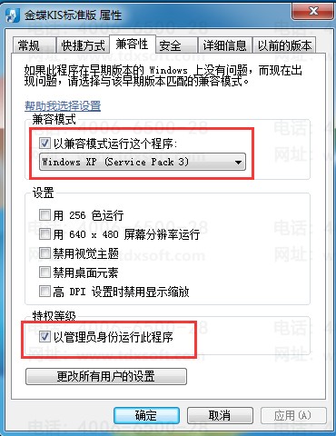 在计算机桌面中单击KIS标准版快捷键图标,单击鼠标右键,单击[兼容性]页签,勾选上“以管理员身份运行”和“以兼容模式运行”。