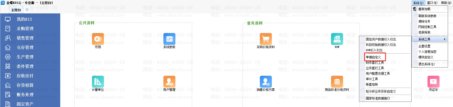 1、主控台界面,点击【系统】-【系统工具】-【单据自定义】;