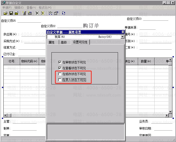 2、打开采购订单选择单据体,单击右键【属性】找到税率字段,点击【设置可见性】,取消勾选录入【在修改状态下可见】、【在录入状态下可见】即可。
