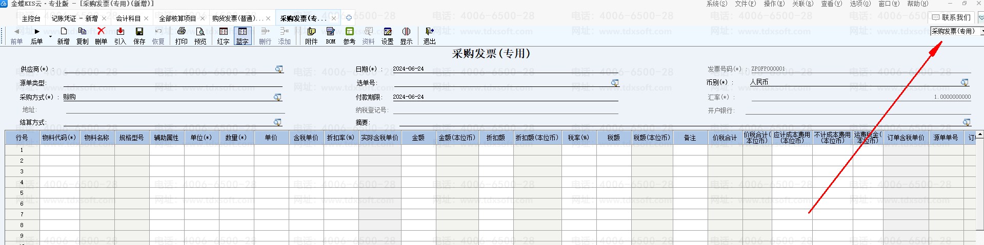 kis专业版采购发票新增界面默认是专用发票如何直接切换成普通发票