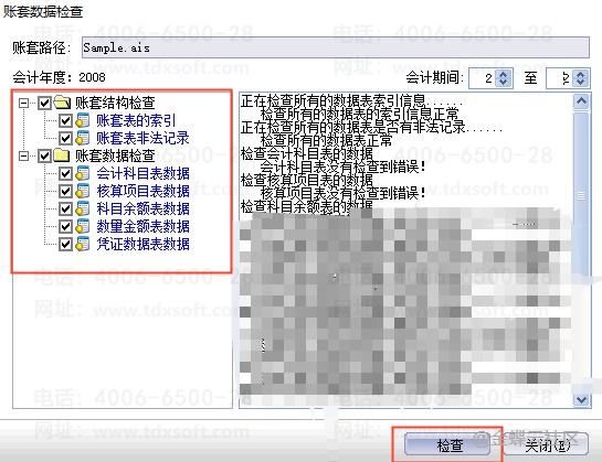 1、进入右上角菜单栏【工具】- 【账套数据检查工具】,左边导航勾选【账套结构检查】、【账套数据检查】,然后再点击【检查】,第一次点击【检查】一般会检测出会计科目表的异常;
