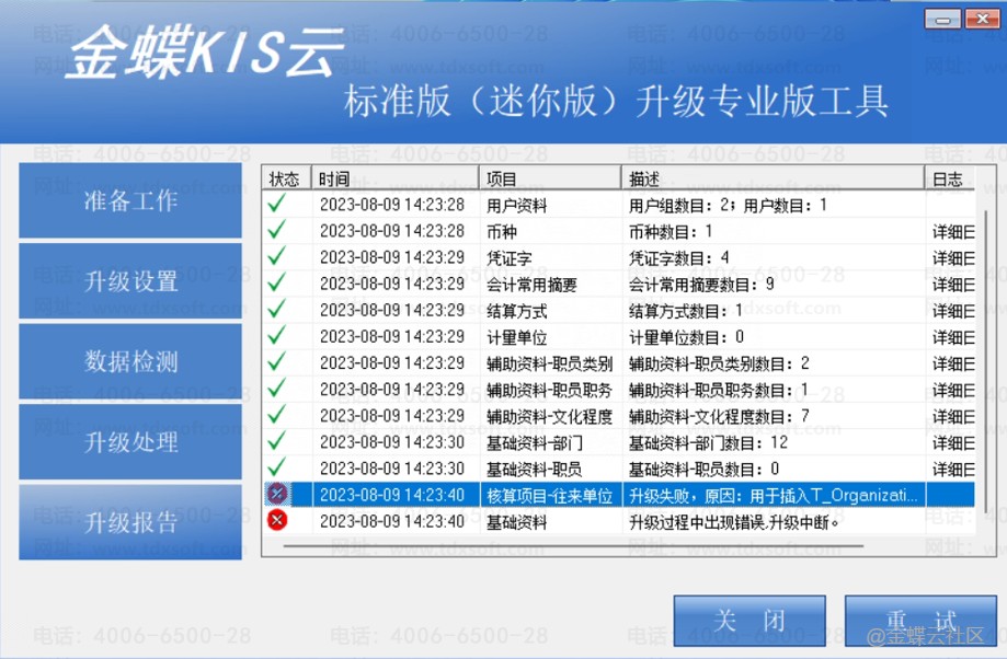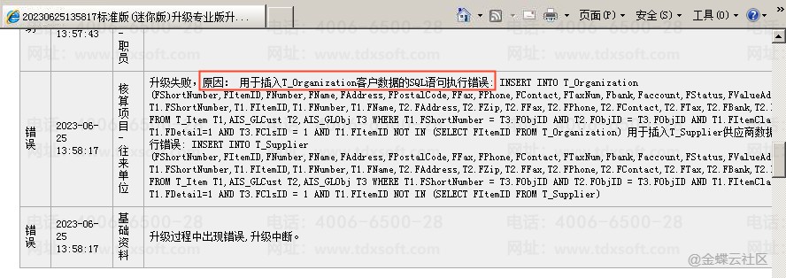 标准版(迷你版)升级专业版提示用于插入T_Organization客户数据的SQL语句执行错误。如下图所示: