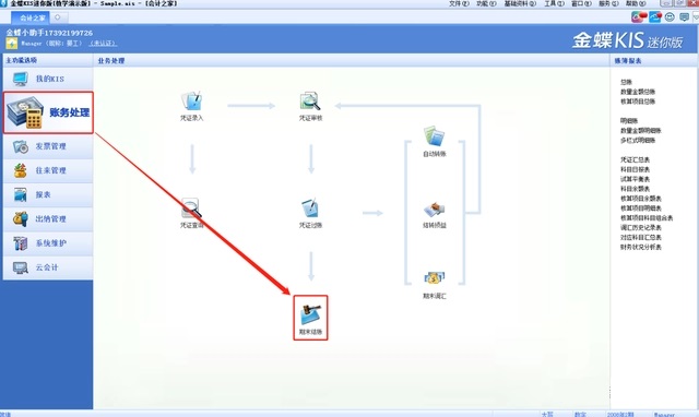1.登录迷你/标准版账套后,点击账务处理模块中的期末结账;