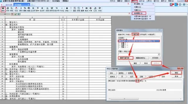 7.打开利润表,点击【属性】-【报表属性】-【页眉页脚】,参考下图把【月】改为【季度】,保存报表后,打印预览即可显示季度。