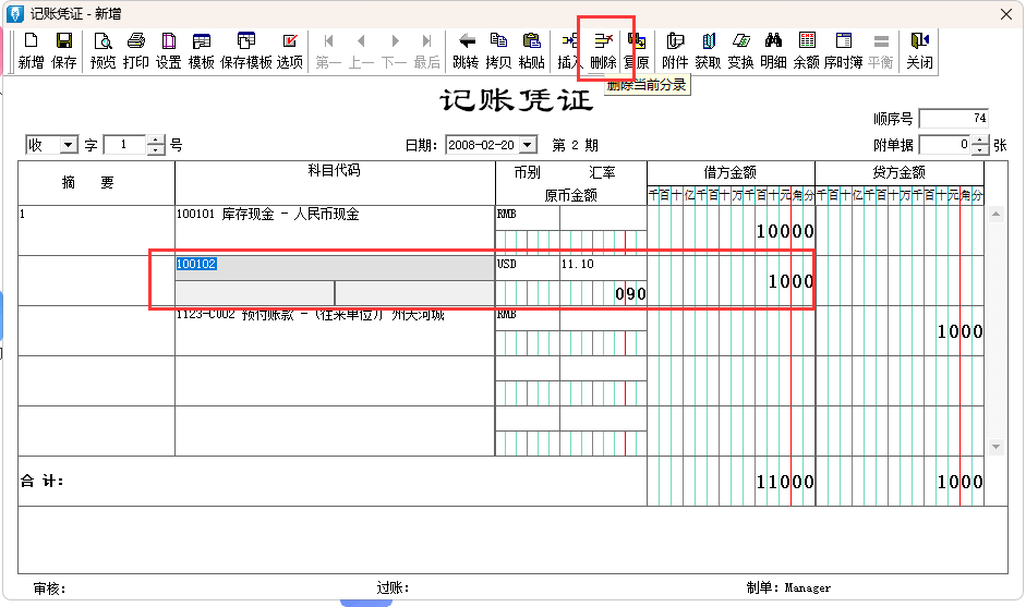 标准迷你版新增凭证时多录入了一行分录,怎么删除中间某行分录数据?