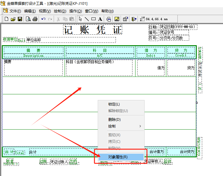 在凭证套打设置中-先单击选中分录行的表格部分-单击鼠标右键-选择【对象属性】在【颜色和线条】页签中-调整设置【填充的颜色】选项后点击确认即可,如下图所示:
