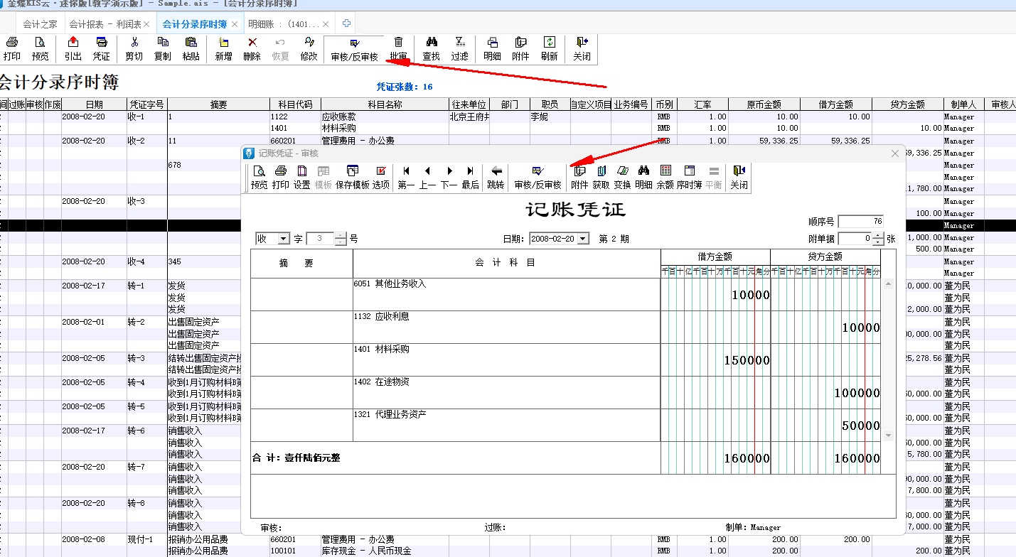 打开软件后点击【账户处理】-【凭证查询】-输入过滤条件查询到需要审核的凭证,选中凭证后点击【审核/反审核】按钮进入到凭证界面后再点击【审核/反审核】按钮即可审核或者反审核凭证