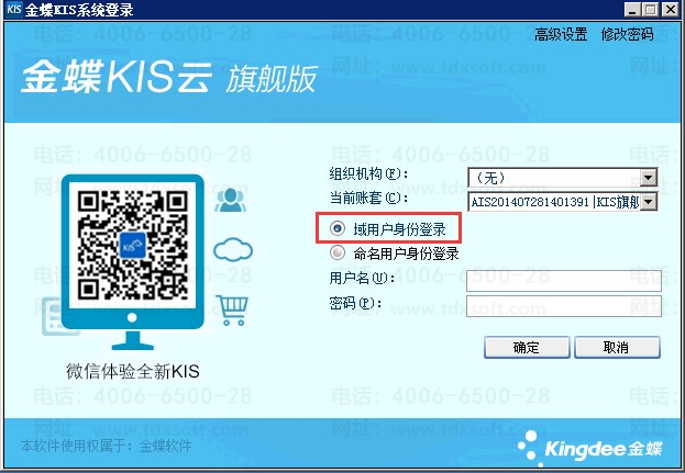 2、点击确定后,系统会根据当前PC操作系统域用户登录到系统中,登录KIS云旗舰版系统的用户信息为第二大步骤中设置的命名用户;