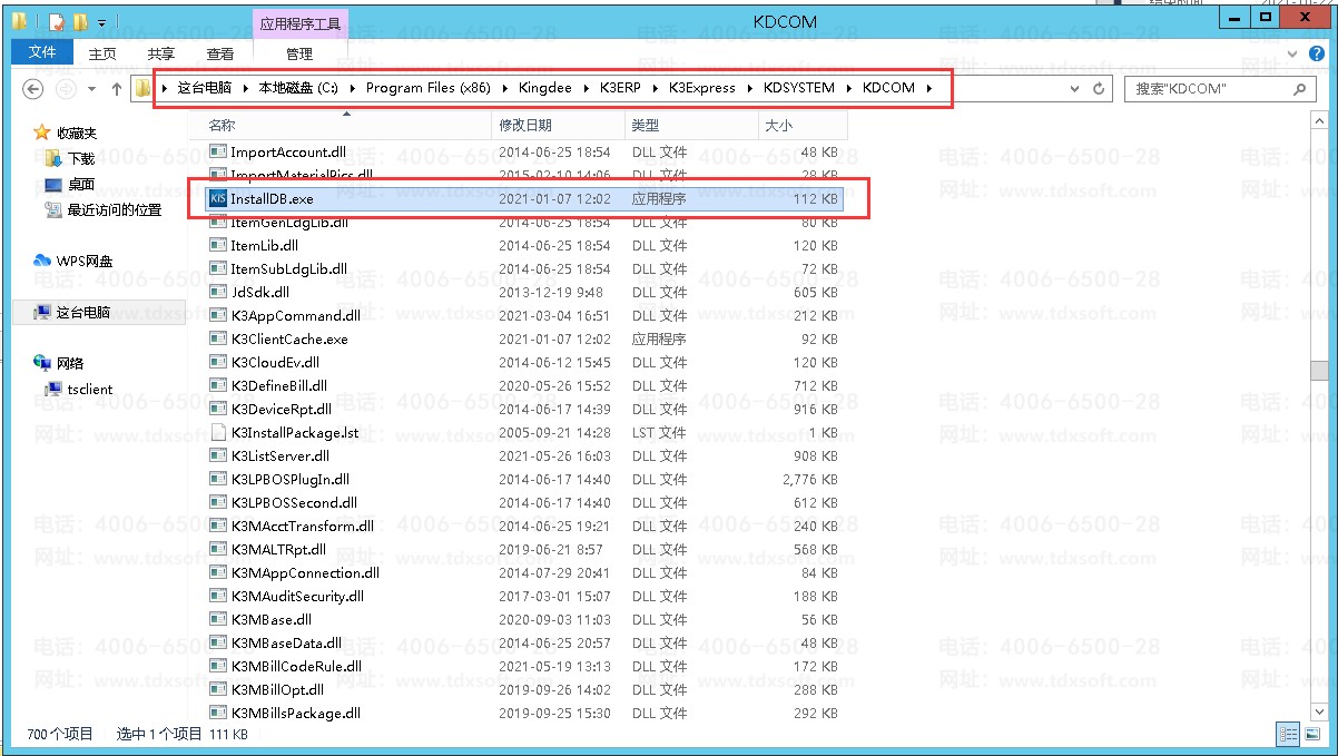 3、在安装目录(:\Program Files (x86)\Kingdee\K3ERP\K3Express\KDSYSTEM\KDCOM)下找到以下文件【InstallDB.exe】,双击运行;