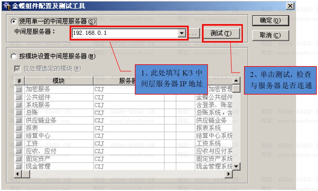 打开客户端的【远程组件配置工具】,检查【中间层服务器】是否设置正确,单击【测试】按钮,是否可以测试通过,如图 7: