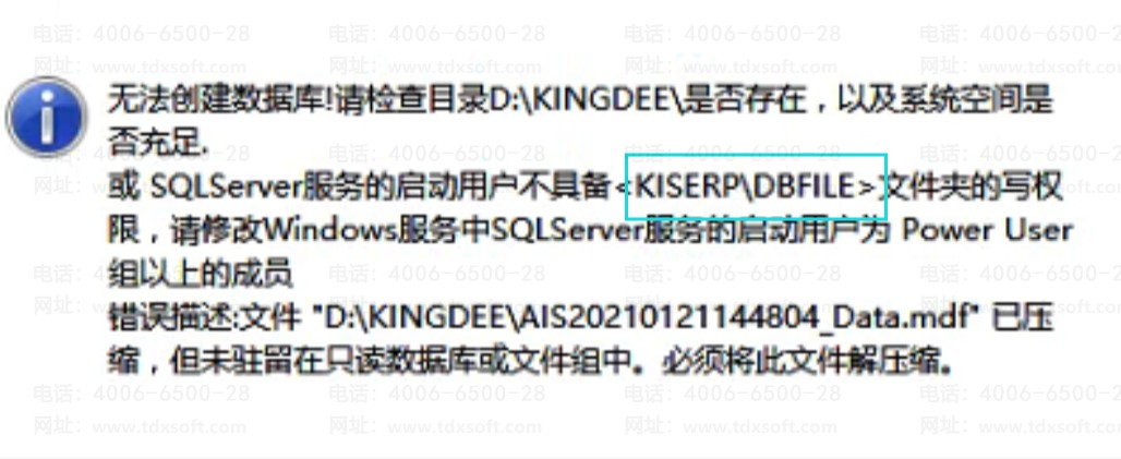 新建账套时提示“无法创建数据库!请检查目录D:\KINGDEE\是否存在,以及系统空间是否充足.或SQLServer服务的启动用户不具备