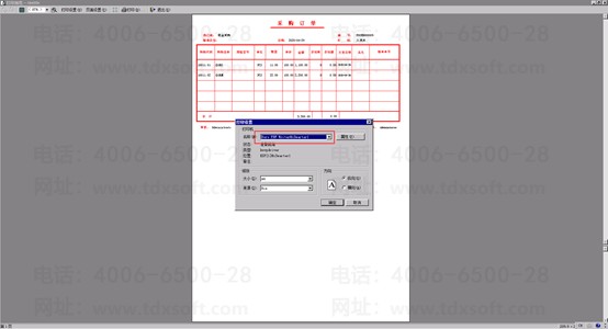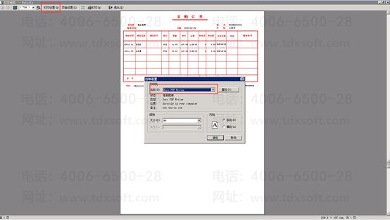 2、 打开采购订单,设置好套打模板之后,点击预览,点击打印设置,选择打印机为映射好的PDF虚拟打印机,再点击确定