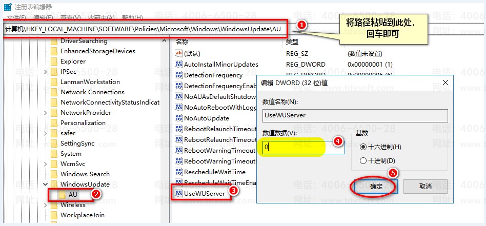 2.导航至HKEY_LOCAL_MACHINE\SOFTWARE\Policies\Microsoft\Windows\WindowsUpdate\AU,并将UseWUServer数值修改为0;