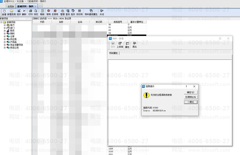 金蝶KIS云专业版16,新增物料时,弹出:数量精度必须在0到8之间;点击确认后,提示:无效的过程调用或参数;错误代码:5(5H);Source:KISEBCGLView,再确定界面就关闭了。
