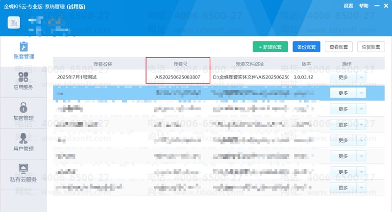 2.找到忘记manager密码的账套,查询账套号。