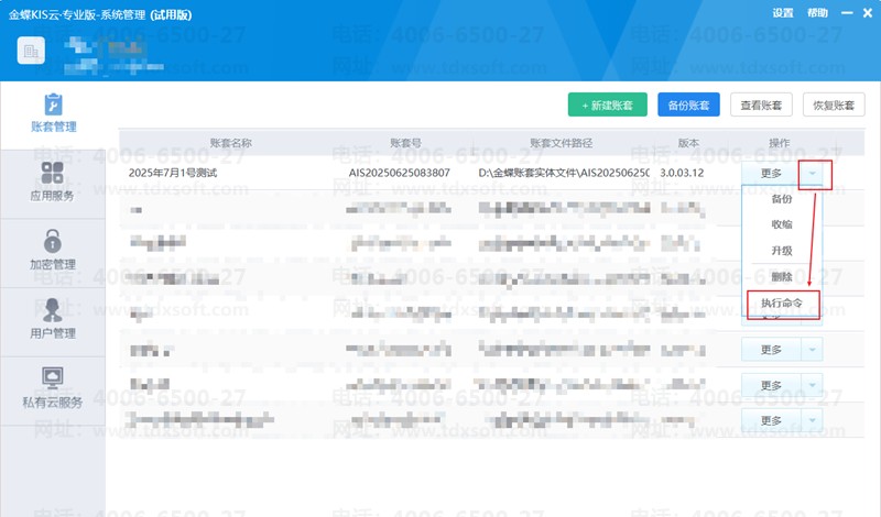 5.找到忘记manager密码的账套,单击更多下拉箭头中的执行命令