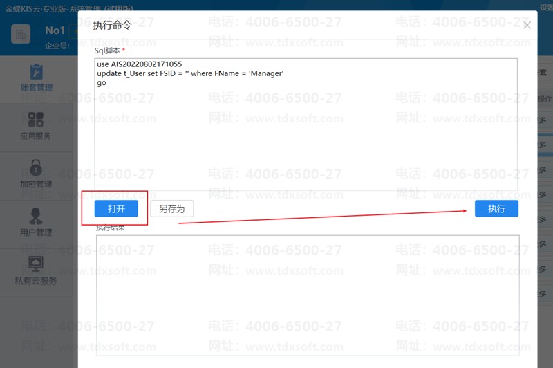 1. 单击打开,选择新建的sql文件,sql脚本就会显示在上方,单击执行,即可清空manager密码