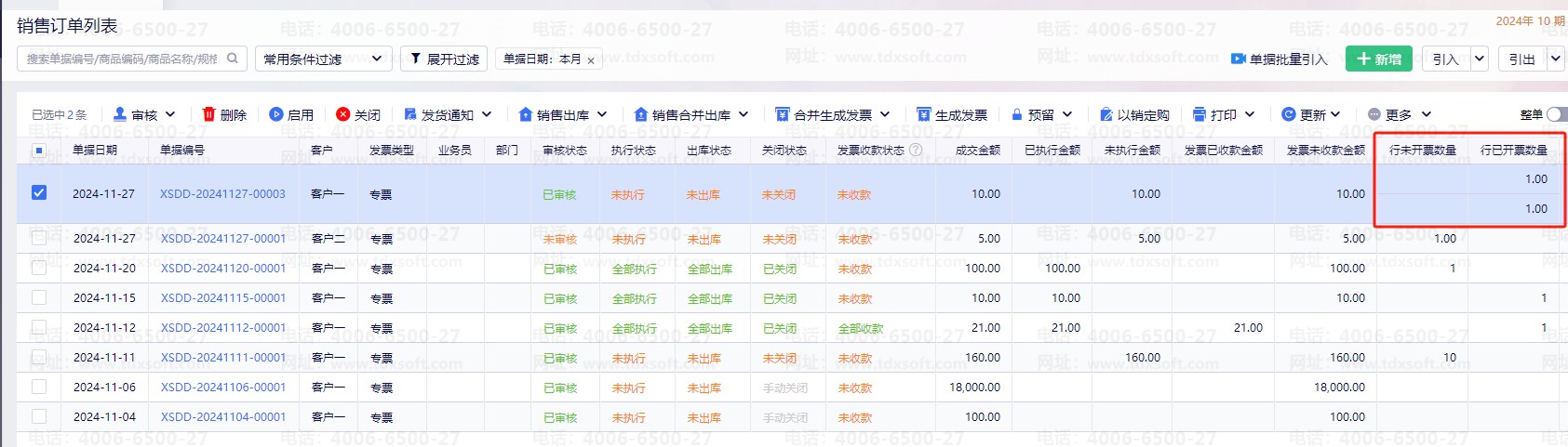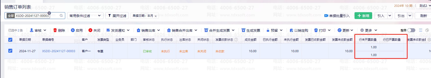 此时,销售订单的“行未开票数量”为空。