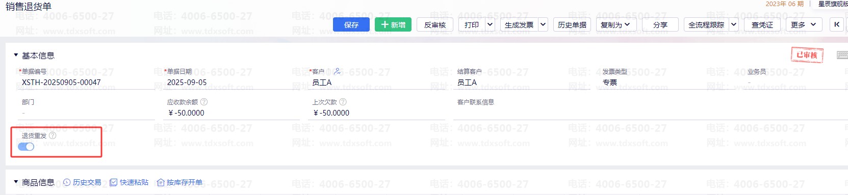 若通过采购退货单或销售退货单下推生成“退货”的发票,“退票重发”按钮不可编辑,是否有开启取决于源退货单是否有开启“退货重发”按钮