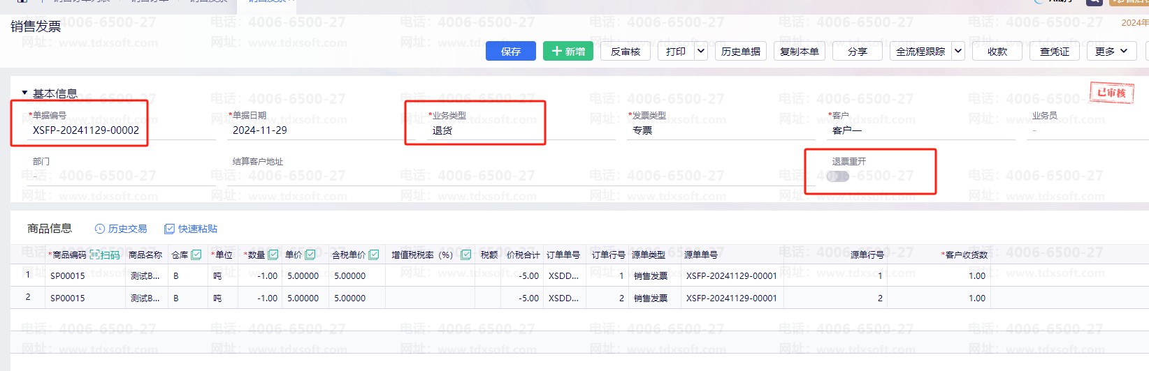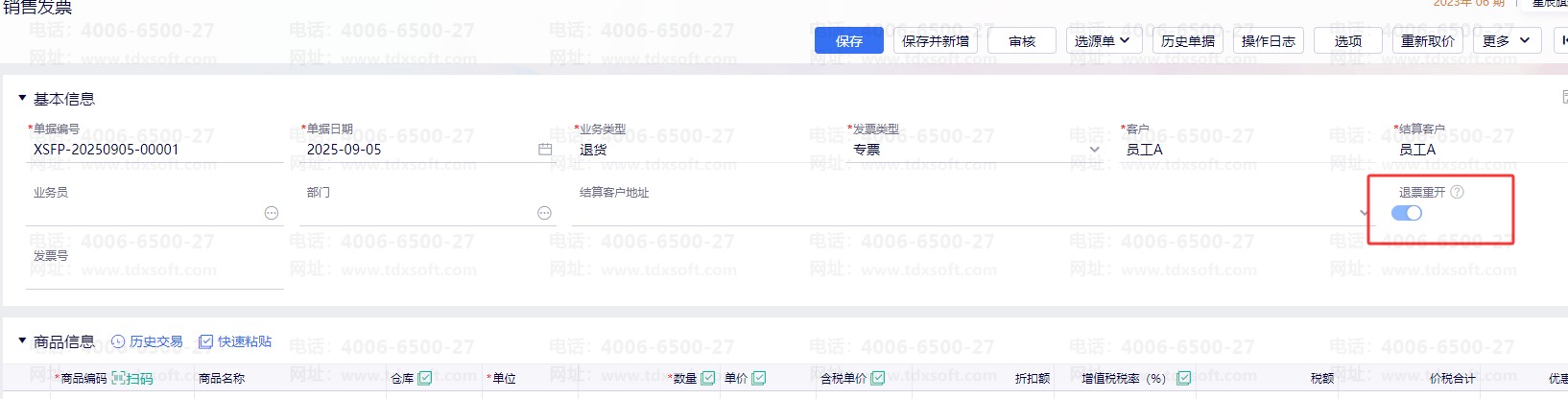 退货类型的销售发票(销售红字发票)没有开启退票从开