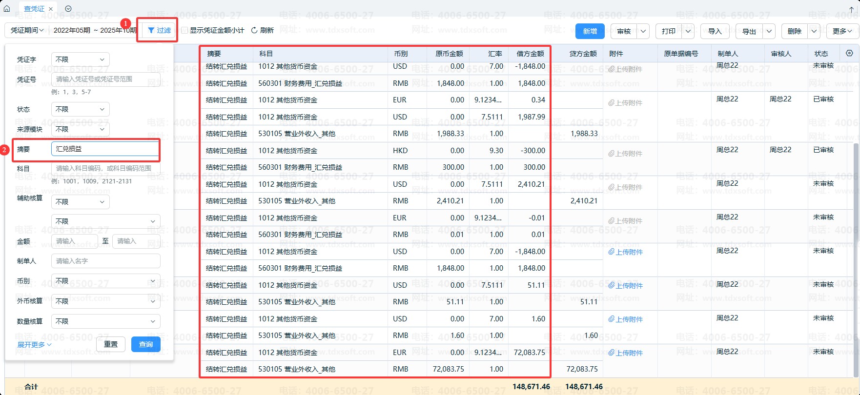2、凭证汇率查询:通过【查凭证】功能,按 “外币核算凭证” 条件过滤查询。具体操作步骤可参考:查凭证界面,如何查询/显示所有币别?