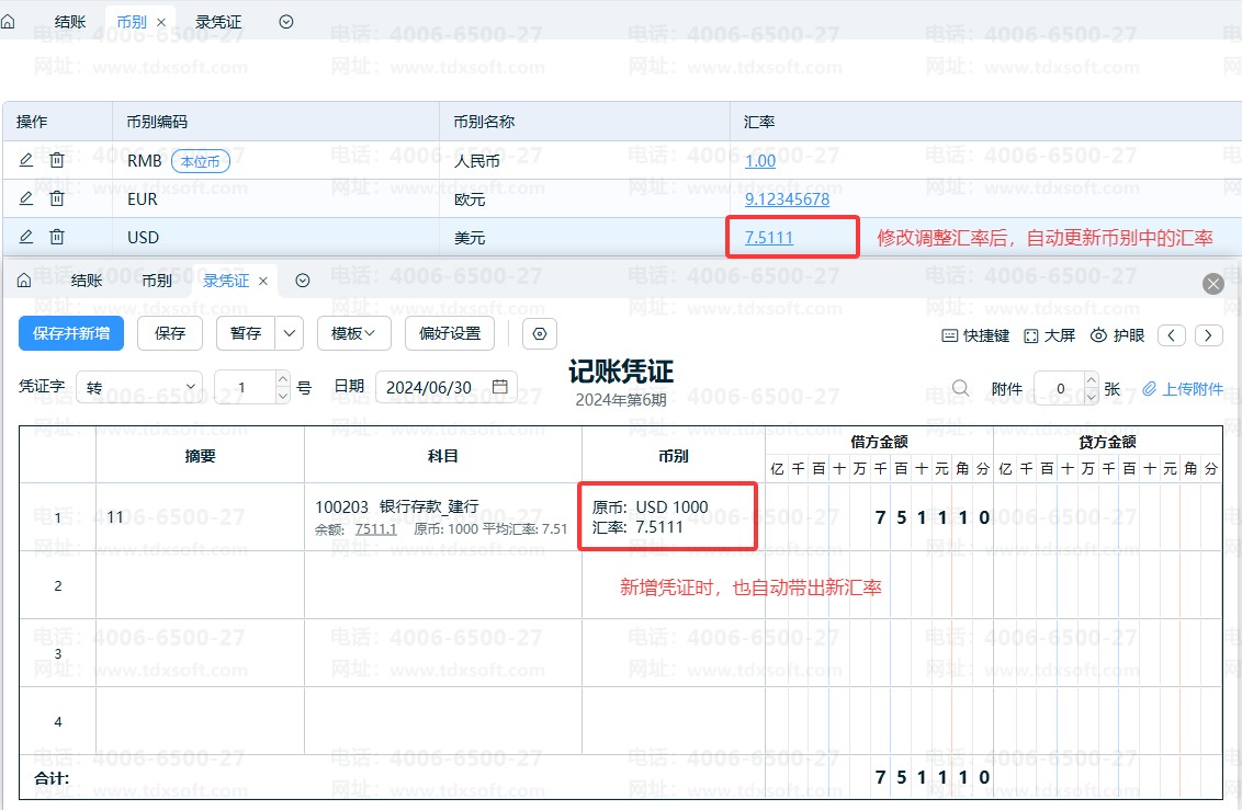 ①汇率修改成功后,新增财务初始余额、新增凭证、当期期末调汇调整汇率、新增外币账户日记账时,系统会自动带出更新后的汇率。如图: