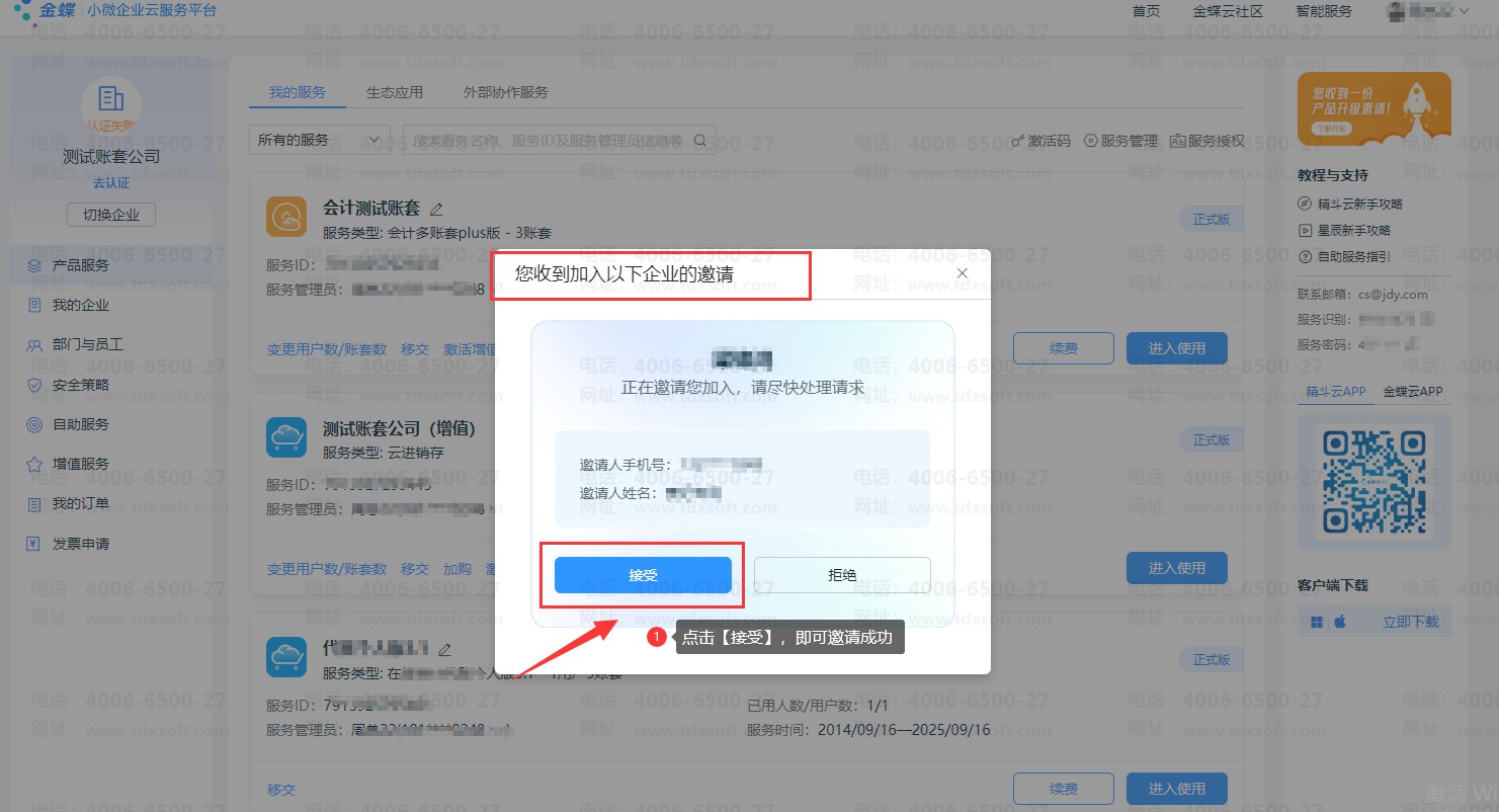 1、子账号登录工作台后,跳出邀请函,点击【接受】即可成功加入企业。管理员可给子账号分配部门及授权账套权限。