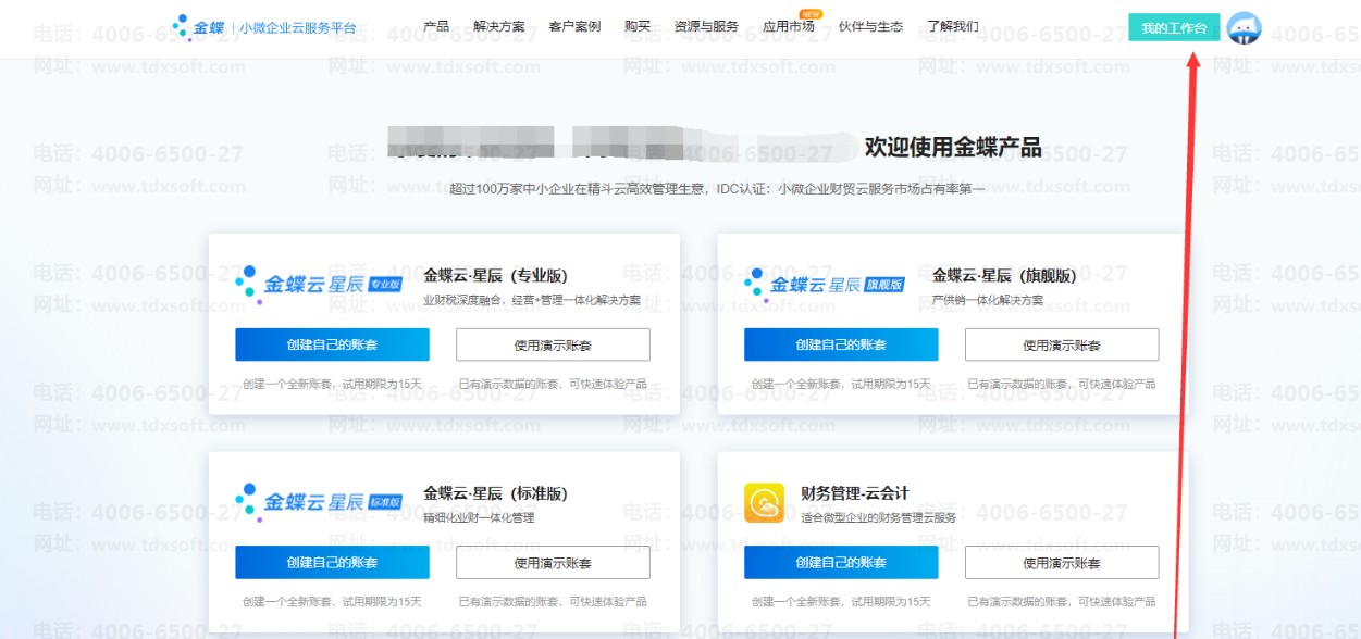 2、若是新账号,还没有任何服务,登录后可点击右上角【我的工作台】刷新一下页面,即可跳出邀请函。