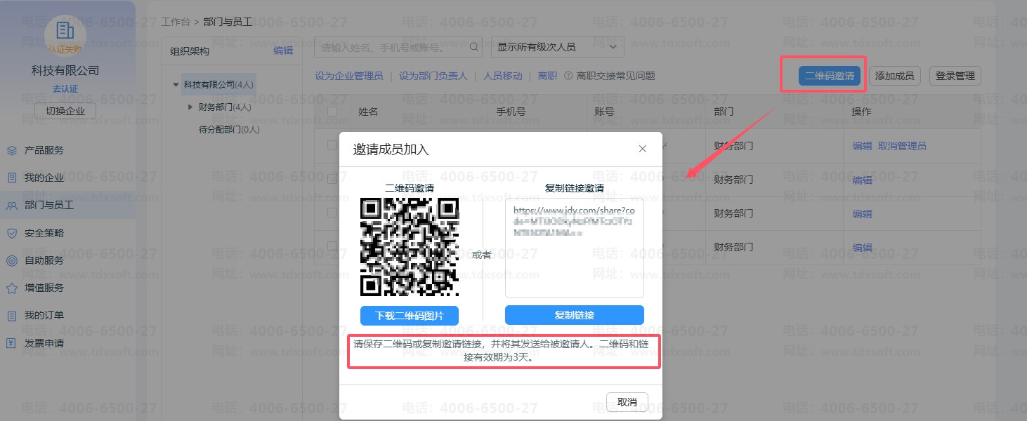 3、子账号不小心点击【拒绝】,由管理员重新邀请即可。若是邀请链接已过期,管理员可以再次邀请子账号重新发送邀请链接或是二维码即可。