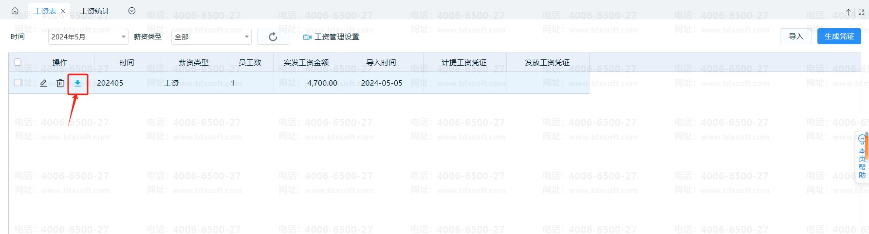 在【工资】-【工资表】中,设置时间筛选条件,查询出对应的工资表后,点击下载