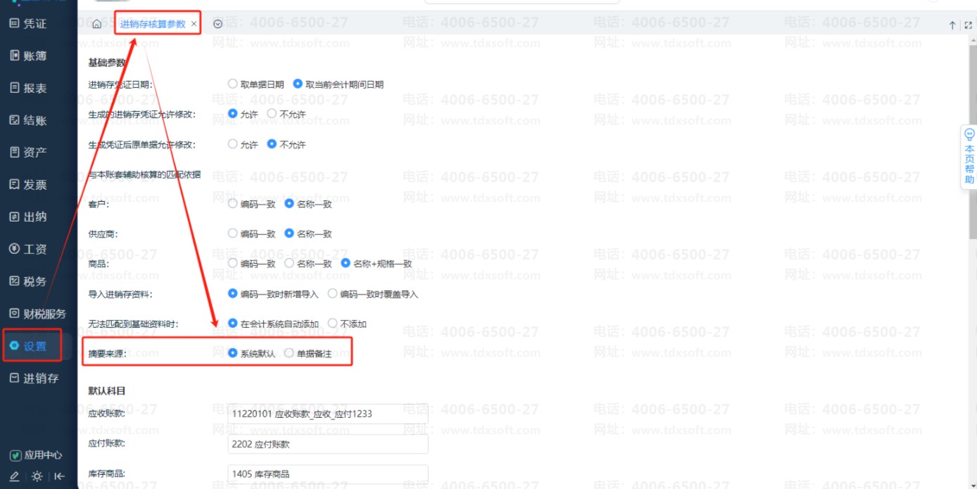 点击【设置】-【进销存核算参数】找到【摘要来源】即可进行选择设置