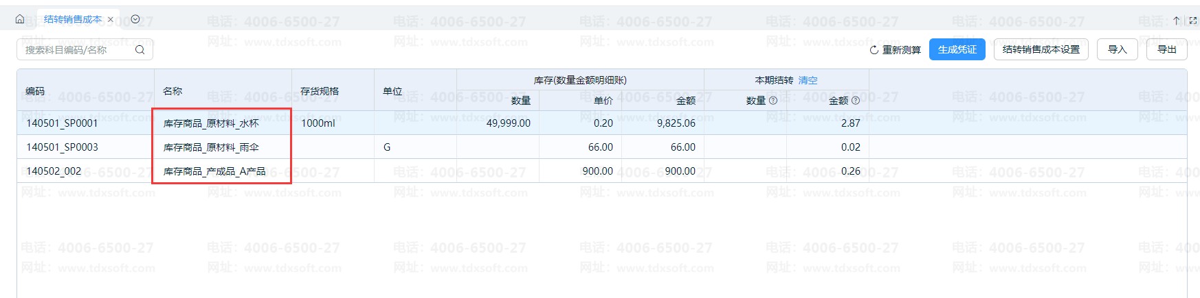 选择一级科目保存设置,系统生成凭证界面会带出一级科目所有的明细数据,如下图:除了原材料数据,也包含了产成品数据