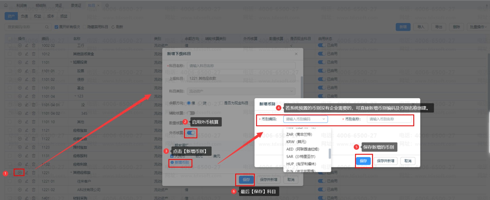 4、新增/修改科目时,支持新增外币。