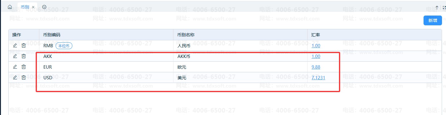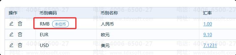 3、在币别列表中显示查看所有币别信息。币别支持修改、删除。对于已发生业务的币别,仅支持修改名称及汇率,不允许删除。
