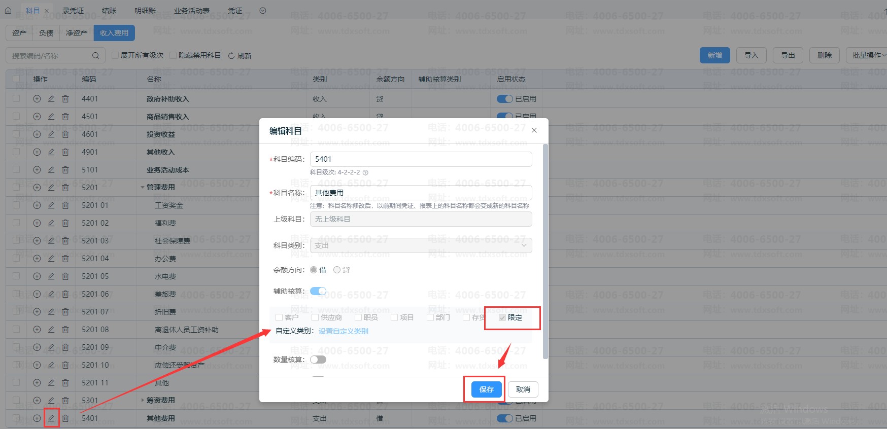 ③ 限定功能效果等同于科目辅助核算。启用【限定】后,该科目的限定、非限定为最明细科目,不允许再添加下级科目。
