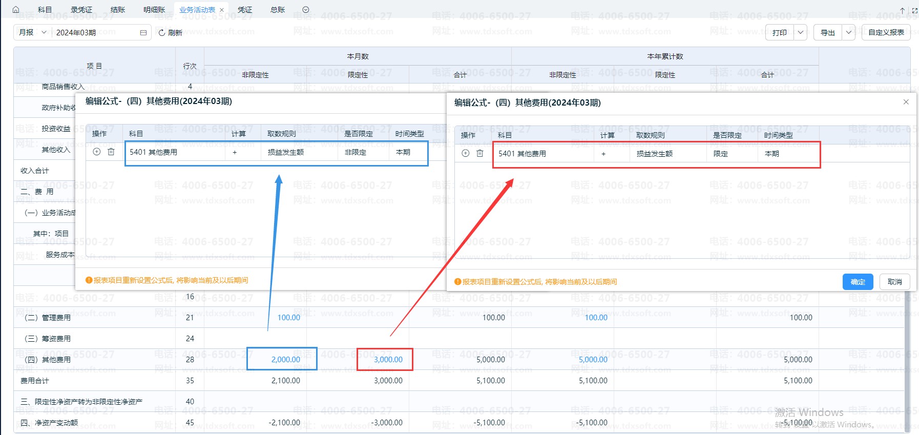 3、业务活动表的公式也区分限定和非限定设置,按限定和非限定设置公式,取损益发生额:(注意:民非的费用科目原不分限定非限定的科目,因此业务活动表默认在【非限定】体现,可以手工修改报表公式)