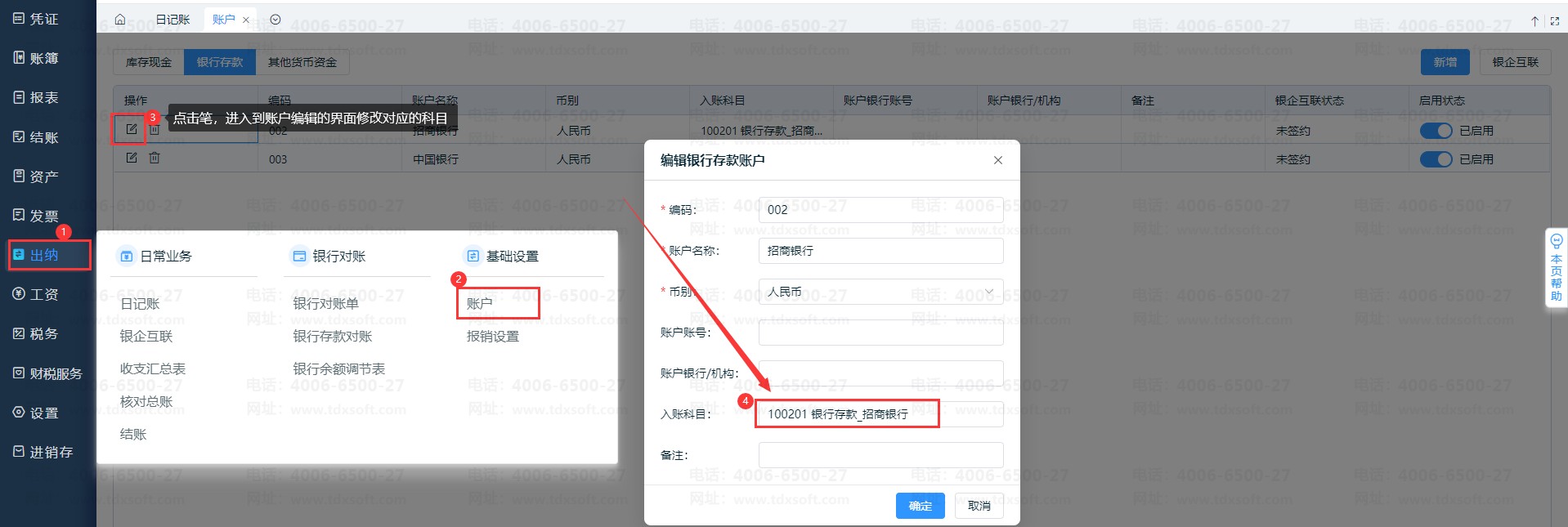 情况1、点击左侧【出纳】-【账户】,检查现金/银行账户是否设置了对应会计科目。若没有设置,需要选择编辑账户按钮,弹出的页面设置入账科目。