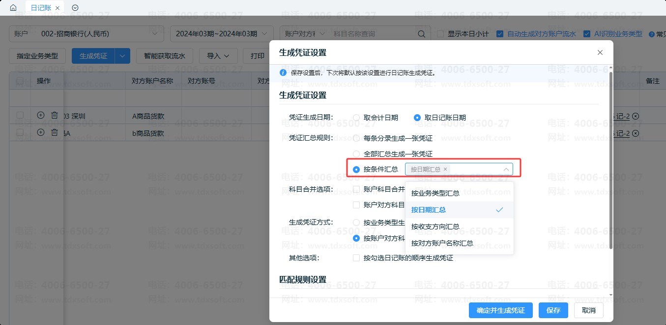 进入【日记账】-【生成凭证设置】,检查凭证汇总规则,选择 “按条件汇总” 并指定具体汇总条件;或是选择“全部汇总生成一笔凭证”。
