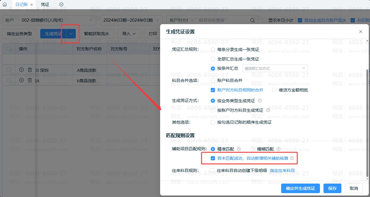 情况4、日记账按智能凭证模板生成凭证时,取不到辅助核算明细,生成暂存凭证。