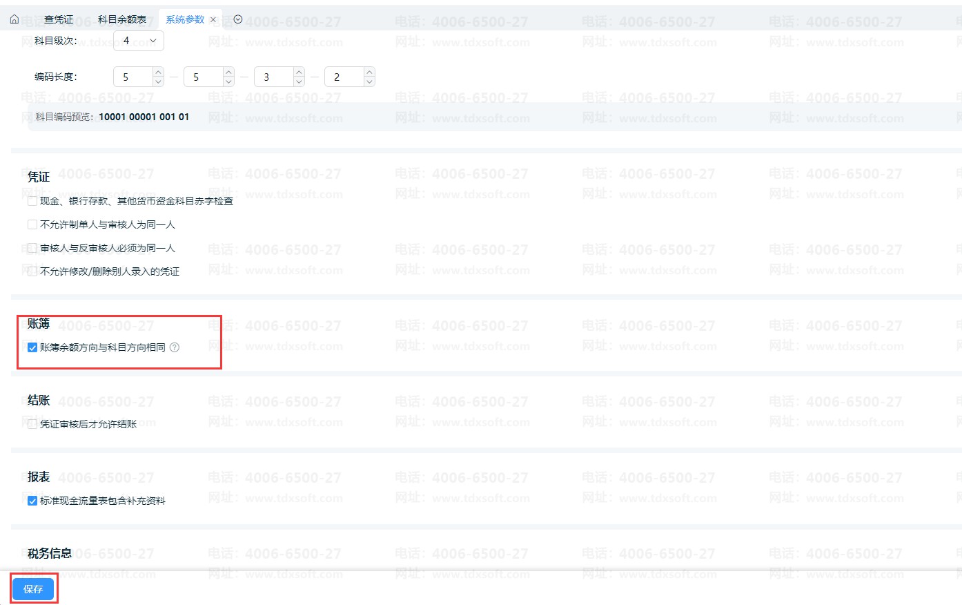 并勾选:账簿余额方向与科目方向相同,并保存