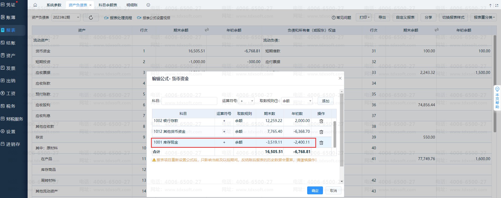 资产负债表仍是按科目属性的余额方向显示,即仍是借方负数,显示效果: