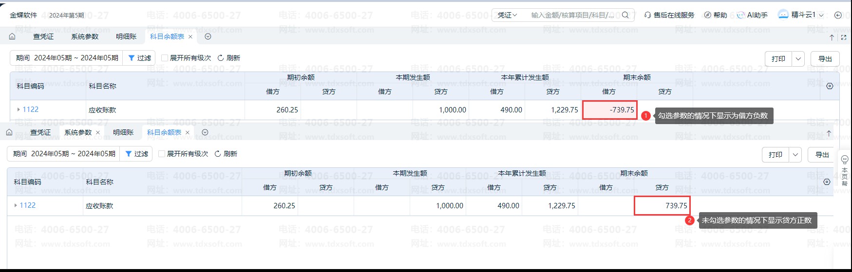 参数勾选:应收账款账簿期末余额显示为借方 -739.75