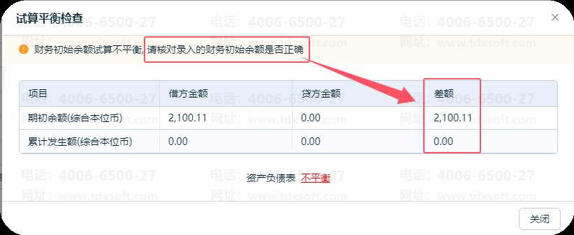 1.请检查录入的数据是否正确,或参考账套启用期间上一期的科目余额表录入